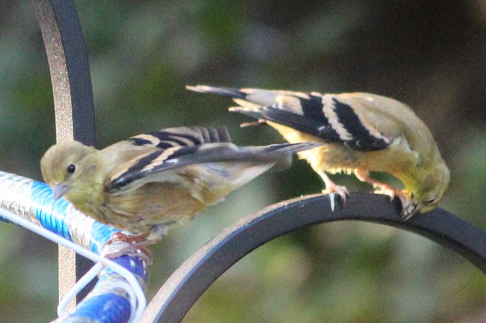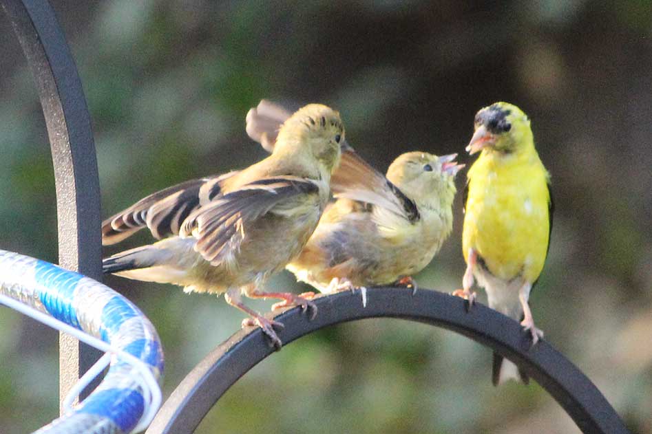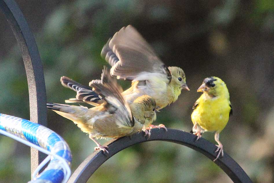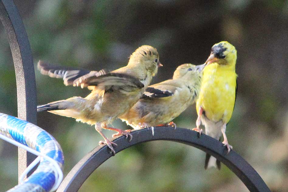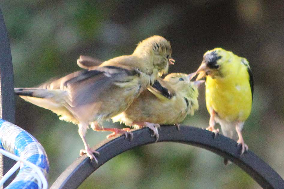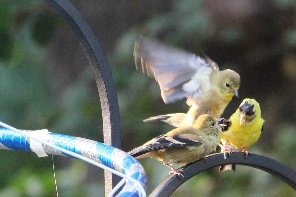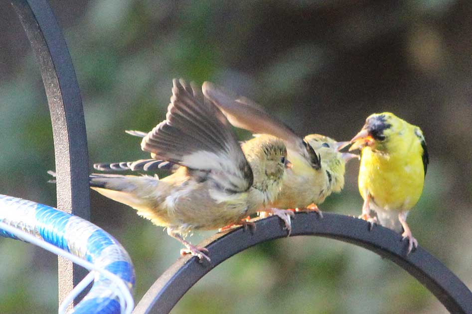 And then, in a startling turn of events, the other juvenile goldfinch flies between the hungry juvenile and its father.