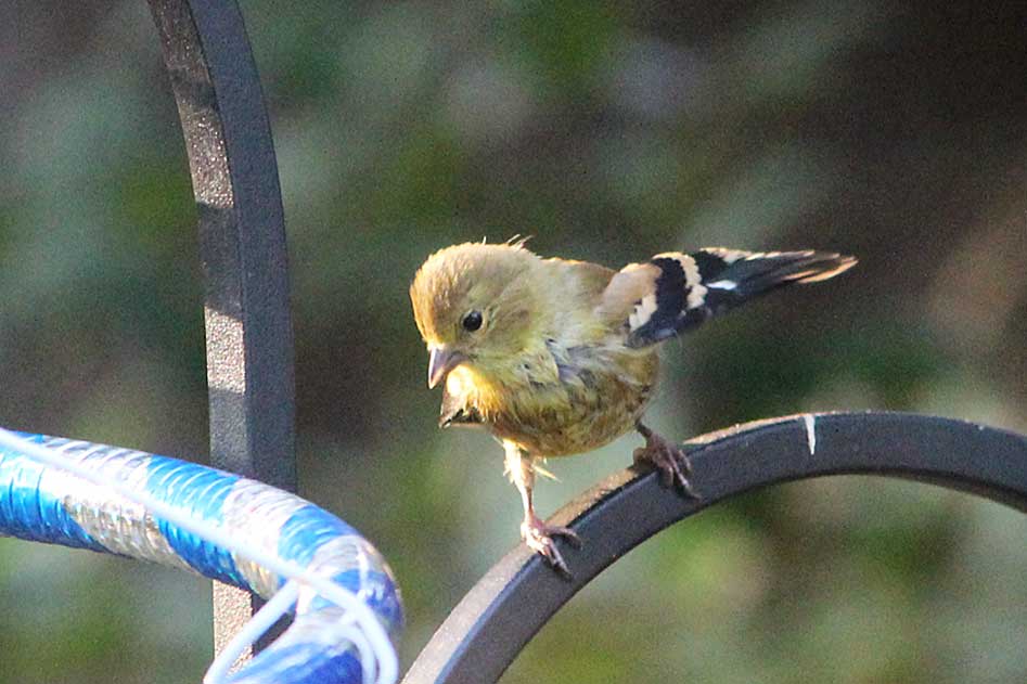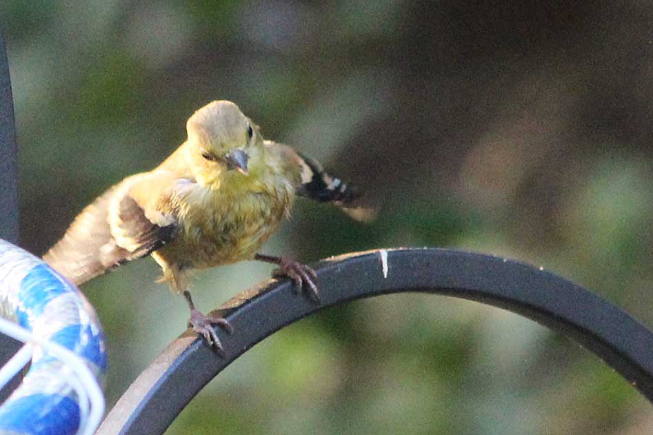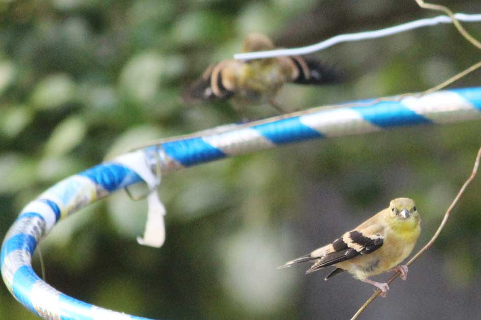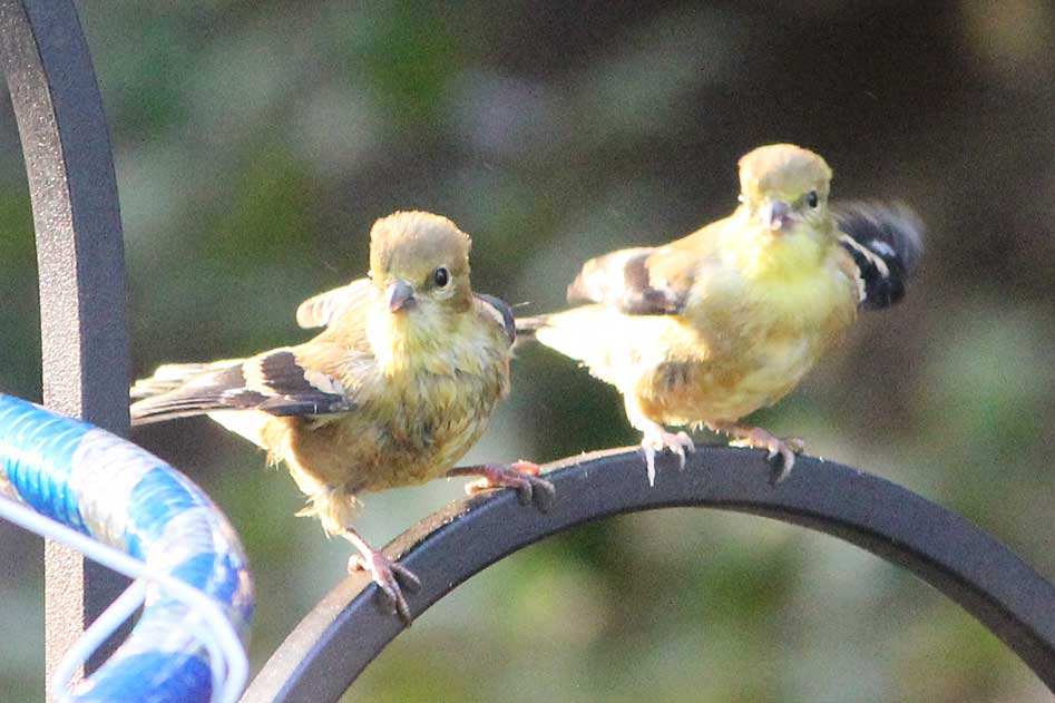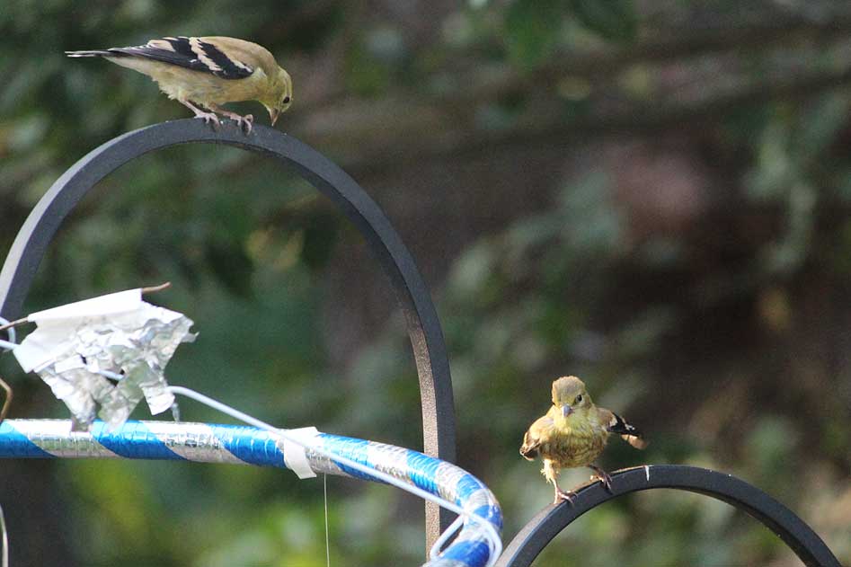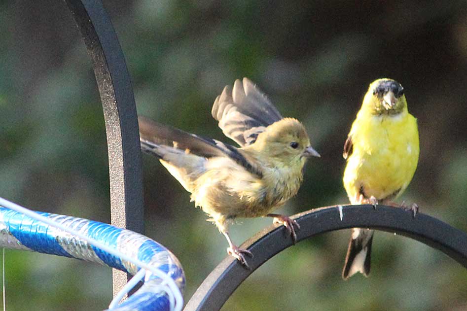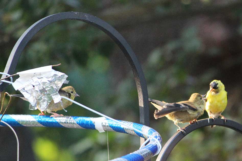 And then, in a startling turn of events, the other juvenile goldfinch flies between the hungry juvenile and its father.