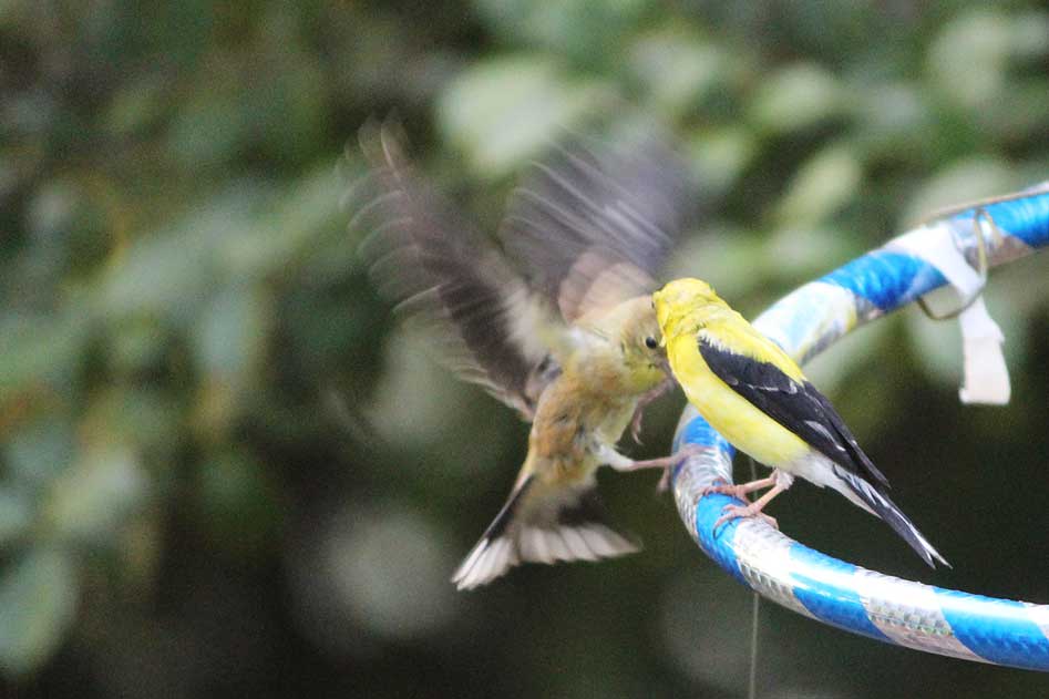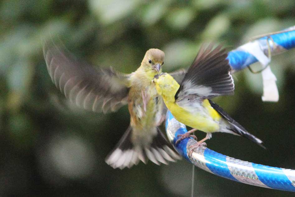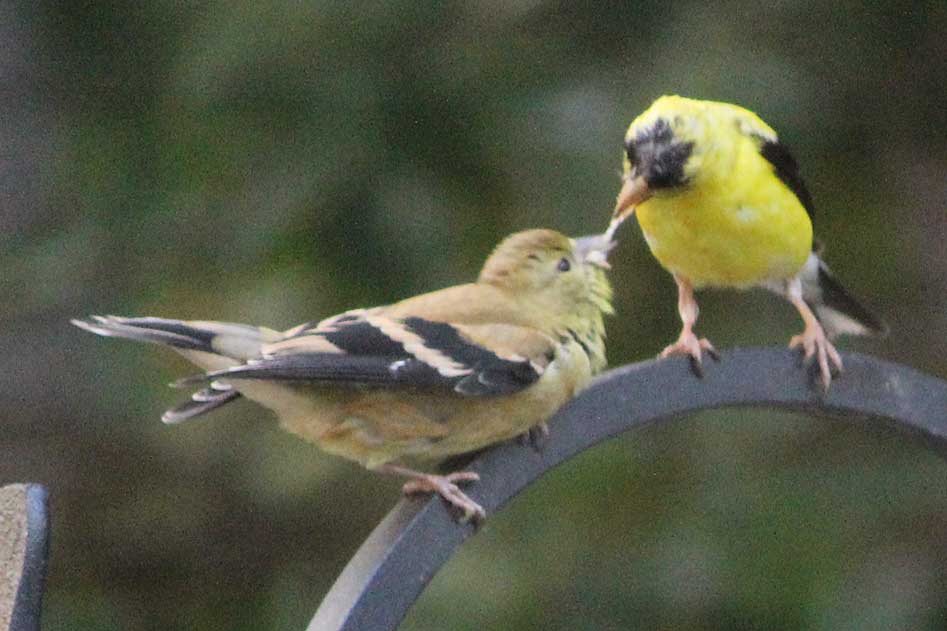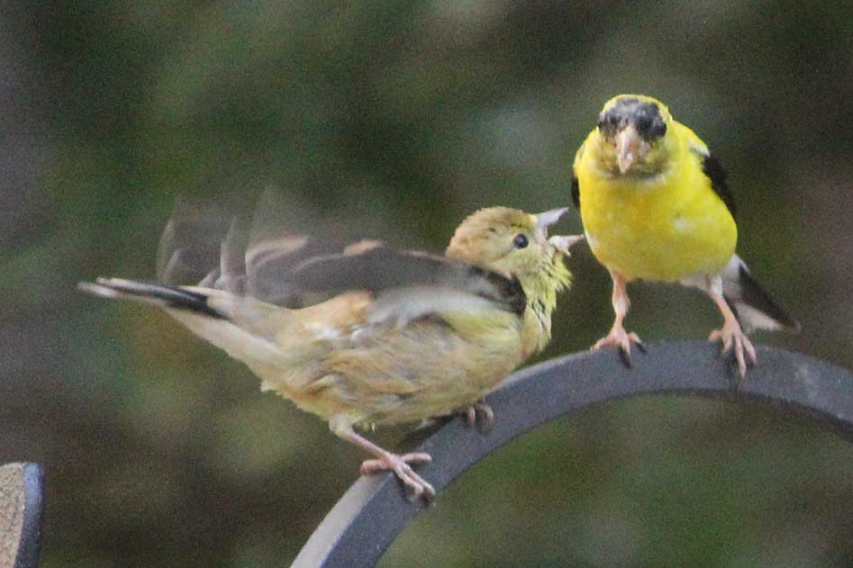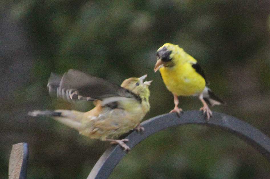 The juvenile goldfinches wait for more food from papa goldfinch. The one juvenile can sustain its begging calls and wing flapping