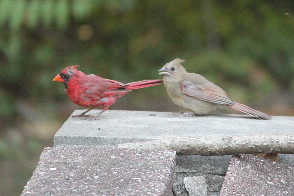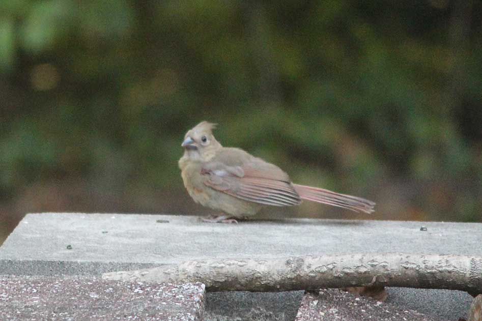 A juvenile cardinal squawks impatiently. I am surprised by how many baby / juvenile birds have appeared in September, begging to be