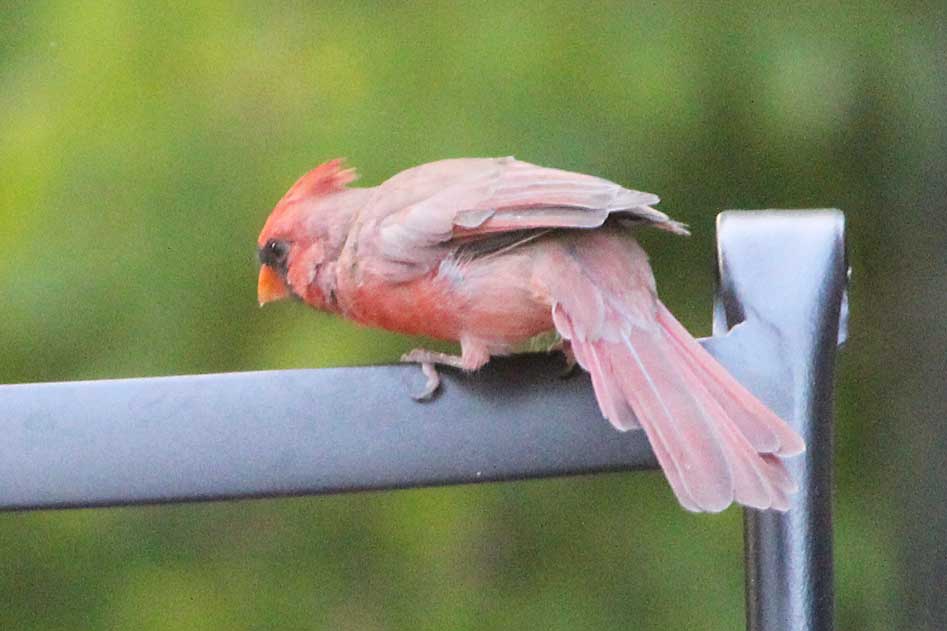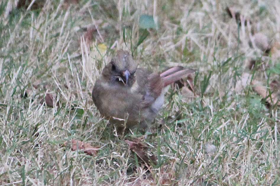 Mother Northern cardinal (orange beak) and offspring (grey beak).