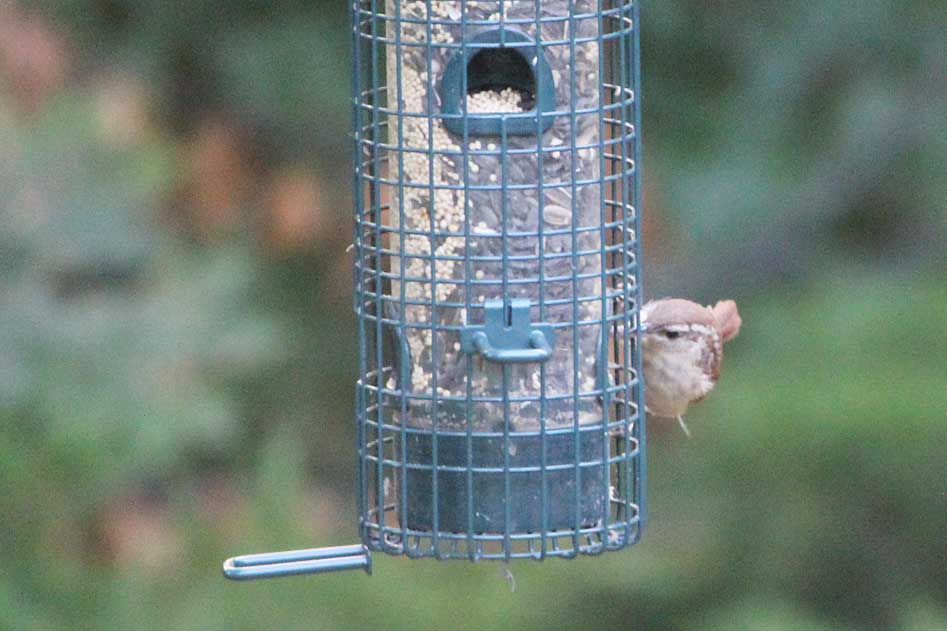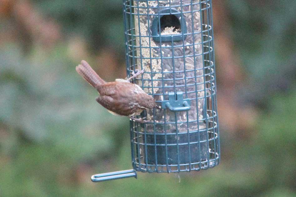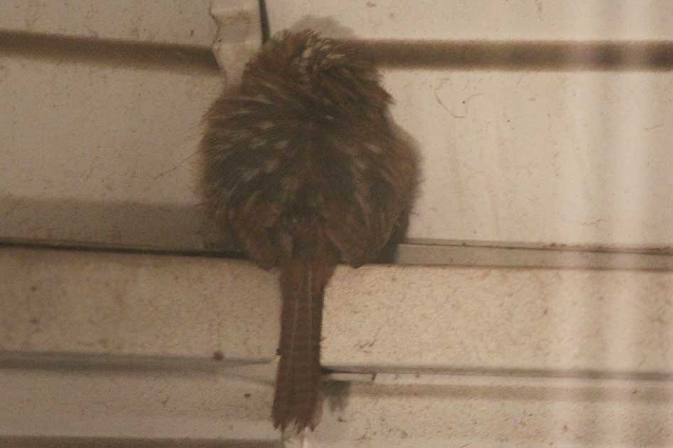 As the light fades (around 7 p.m.), a lone Carolina wren spots a corner under a metal awning, and flies up into the corner, under the awning.