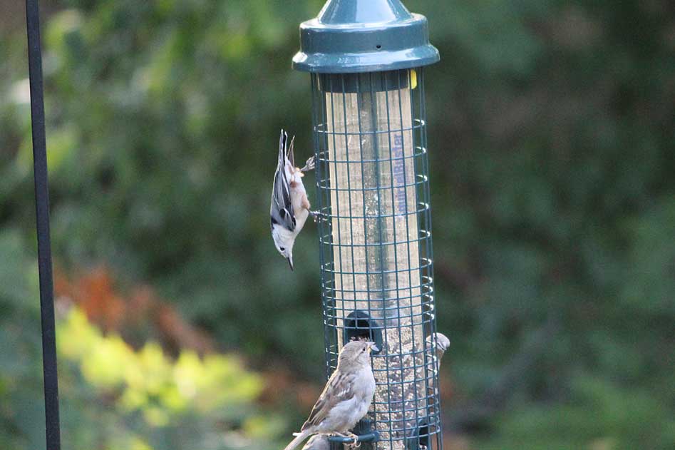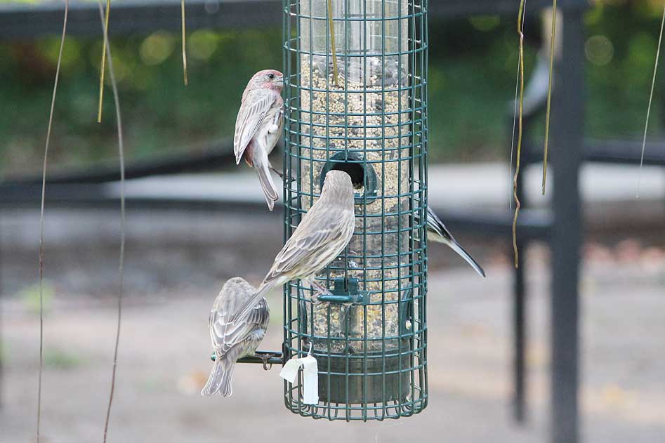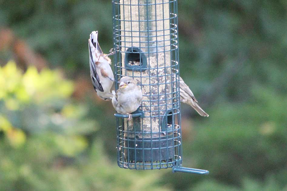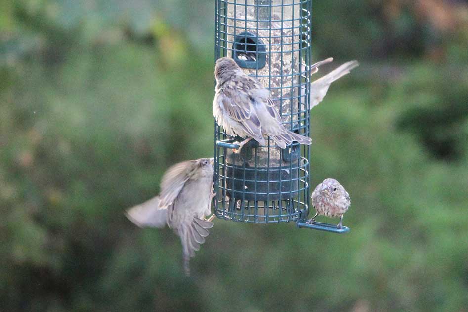 The feeders are all put out. The house sparrows fight over feeding spots while a house finch looks on.