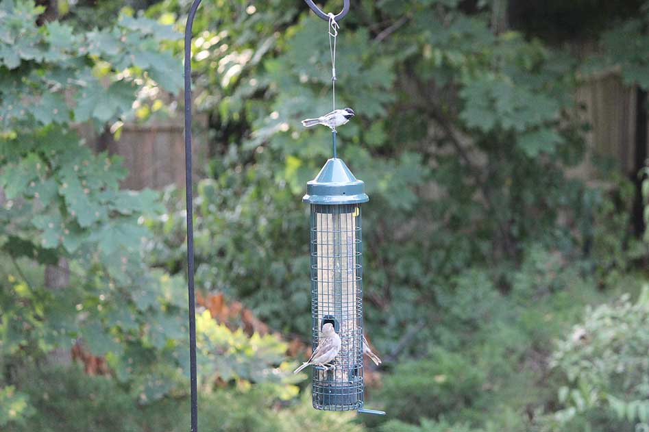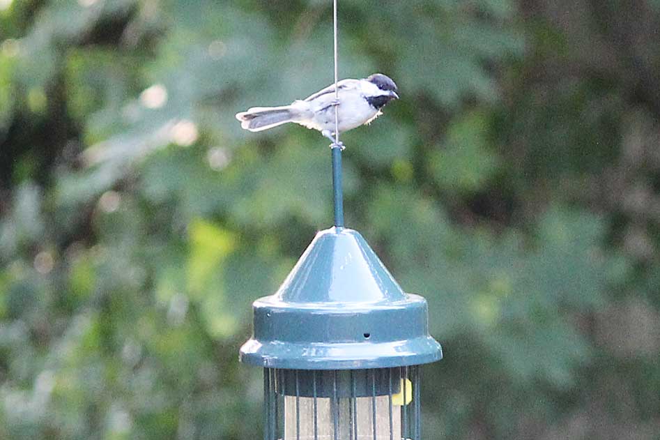 And back on the house sparrow feeder, the black-capped chickadee finds an opening, and darts in.
