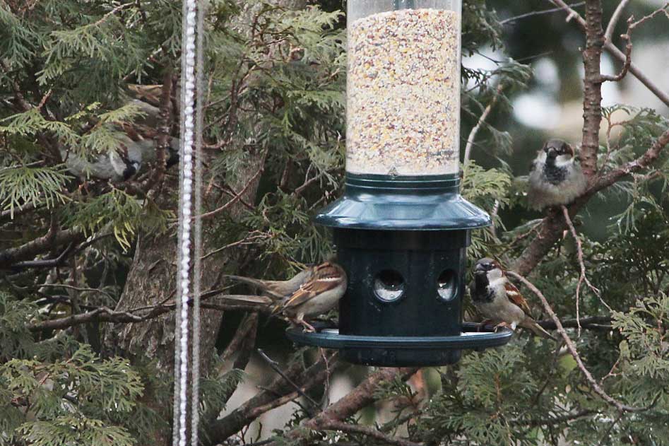 The house sparrows spar endlessly at the feeder, displaying dominance, expanding their perceived size, and sometimes almost fighting.