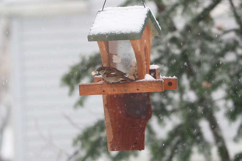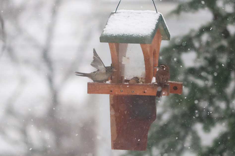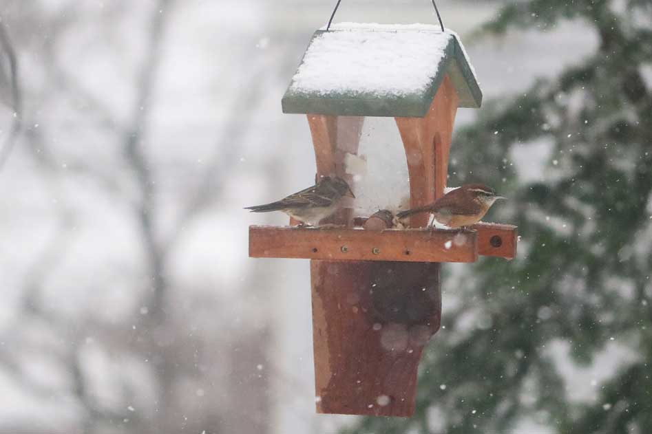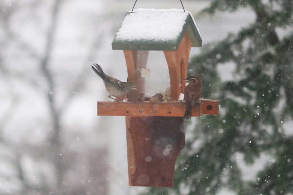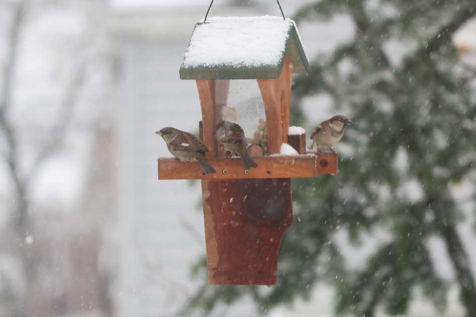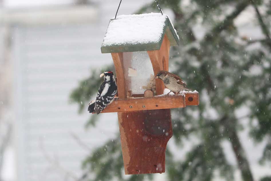 The peanuts are intended for good friends like nuthatches, titmice, chickadees, blue jays, and woodpeckers. Of course, you can't stop house sparrows from joining in.