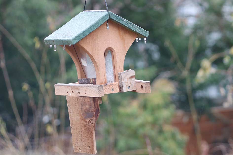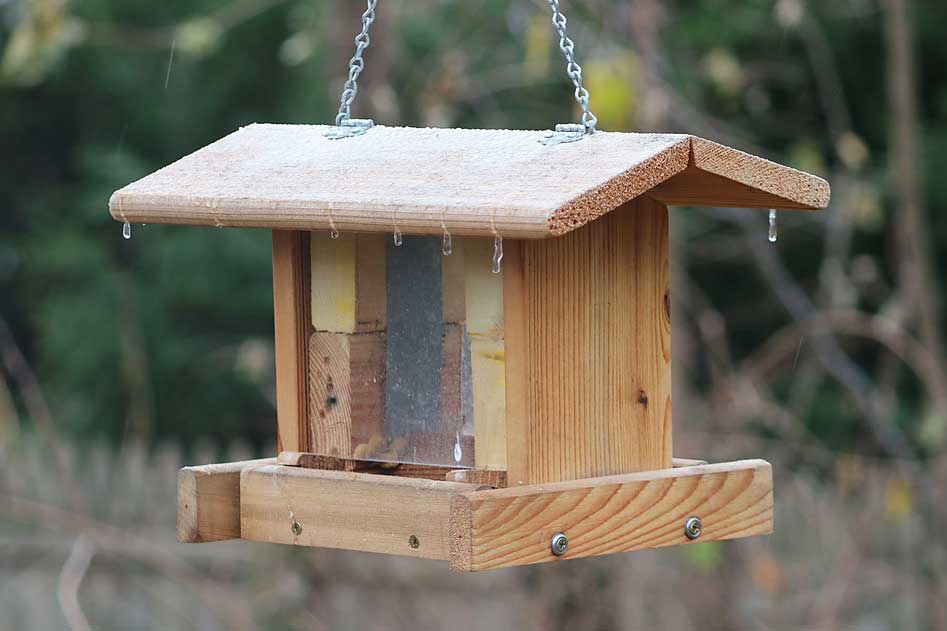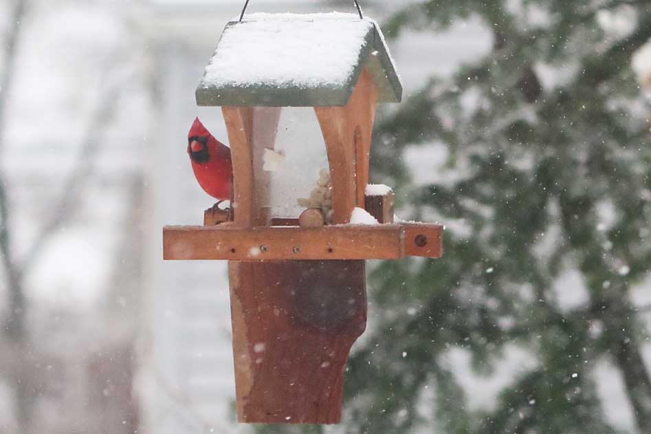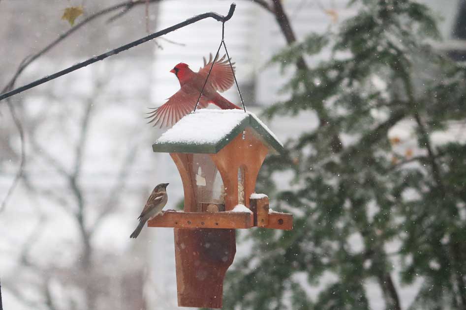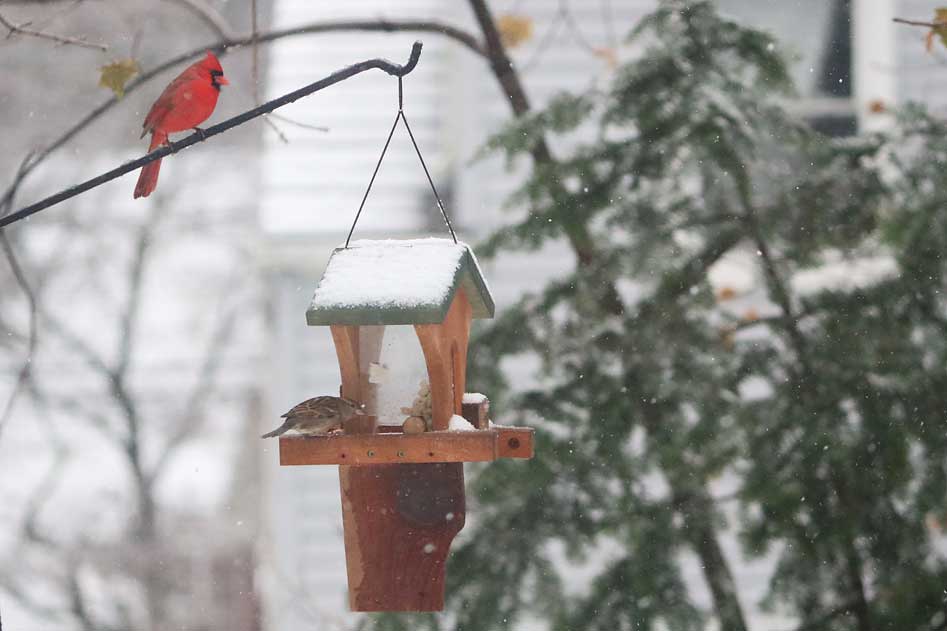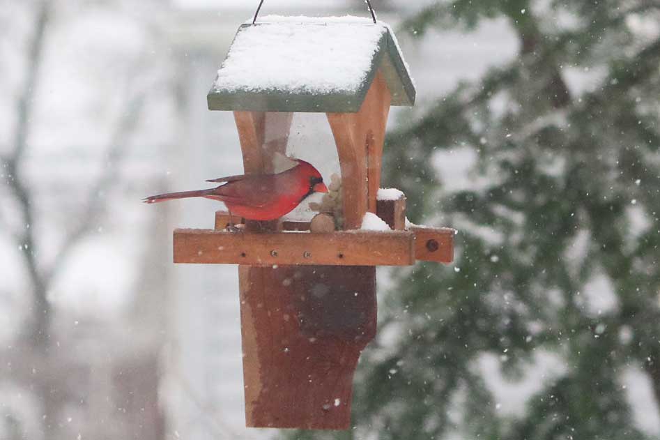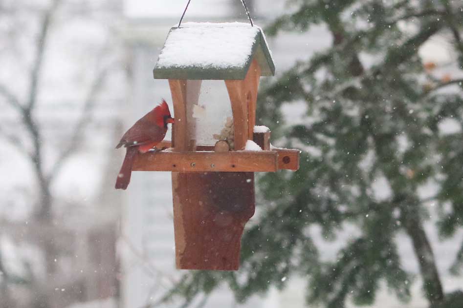The peanuts are intended for good friends like nuthatches, titmice, chickadees, blue jays, and woodpeckers. Of course, you can't stop house sparrows from joining in.