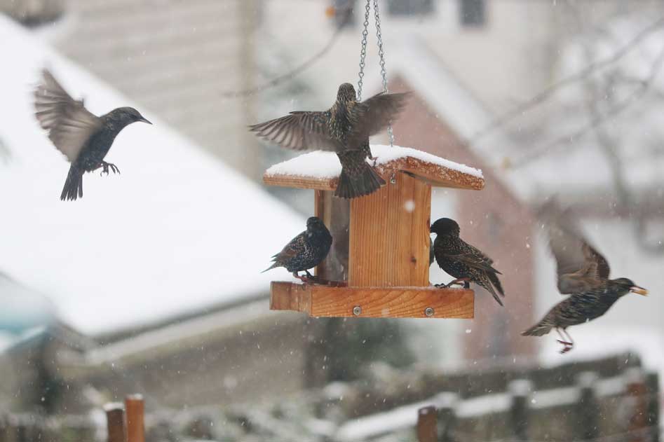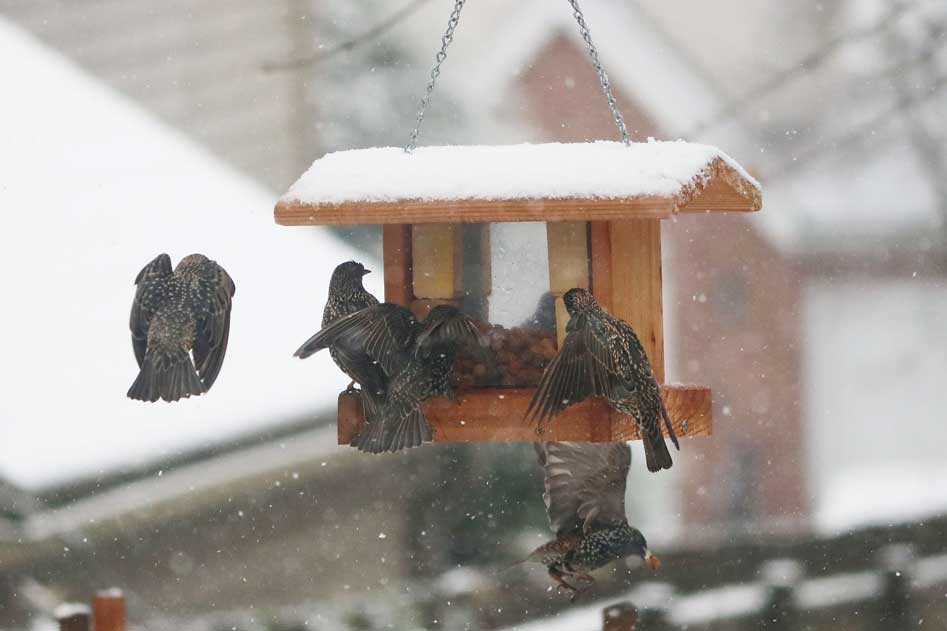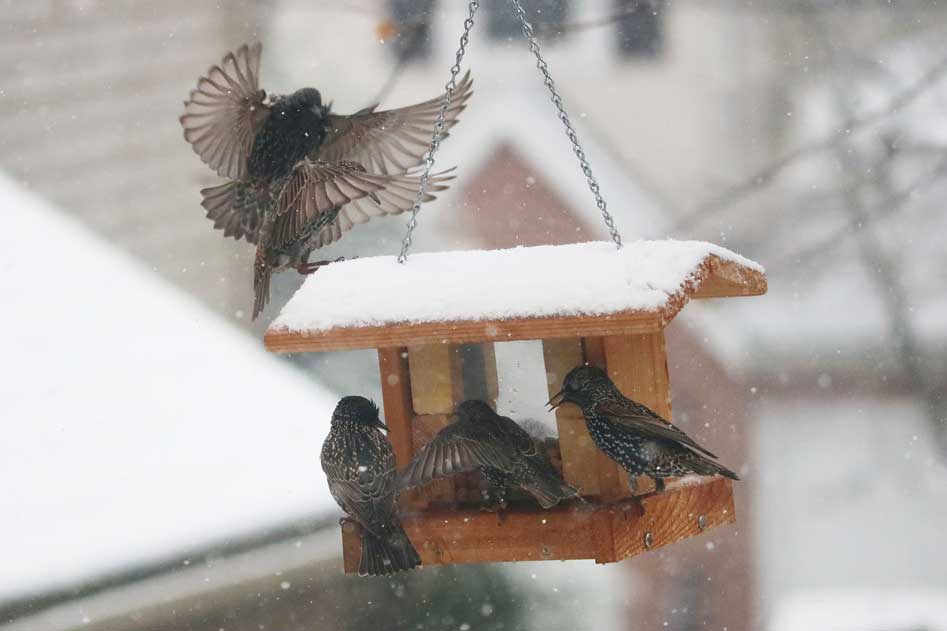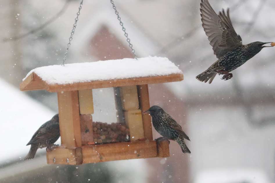 Once a gang of starlings finds a food source, the call goes out, and they swarm the goodies, behaving like overgrown house sparrows.