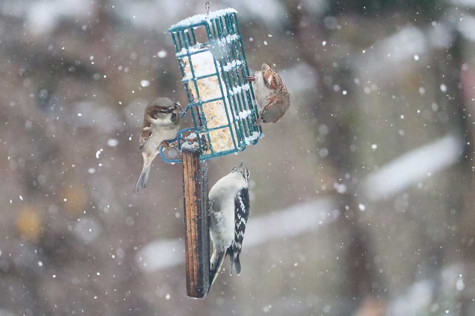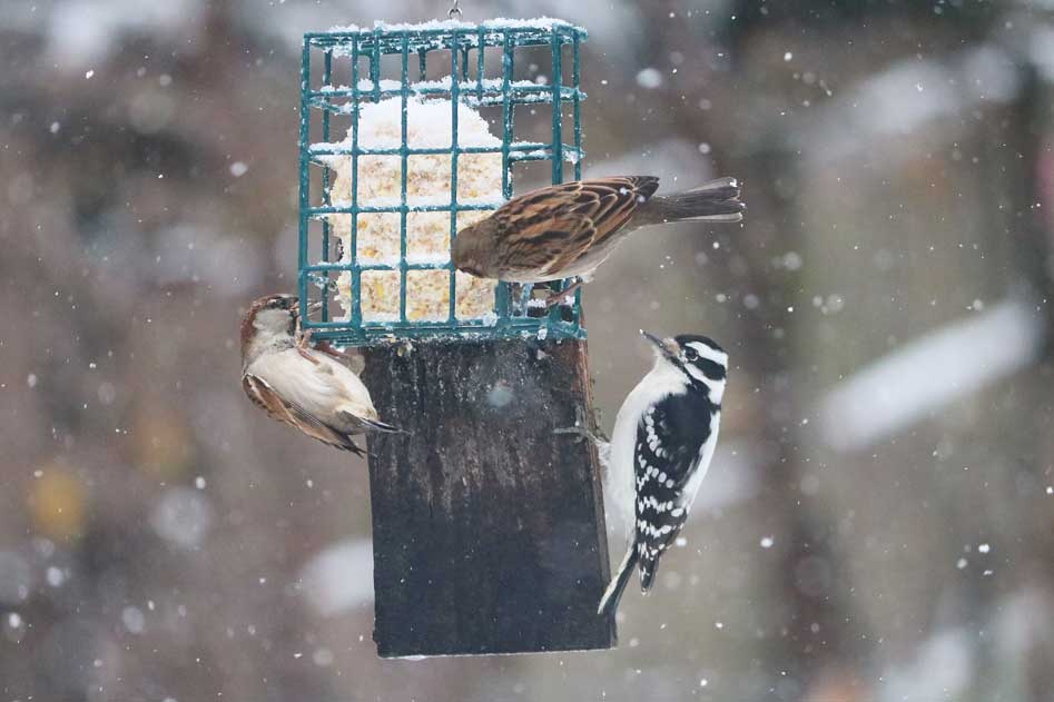 A female downy woodpecker waits patiently while the invaders attack the suet.