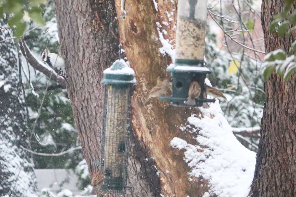 Behind the main feeders, a hairy woodpecker scoots up the tree.