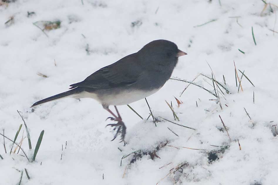 Finally, after a much later than usual arrival date, dark-eyed juncos are visiting the yard.