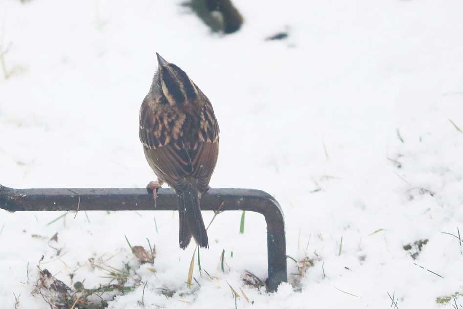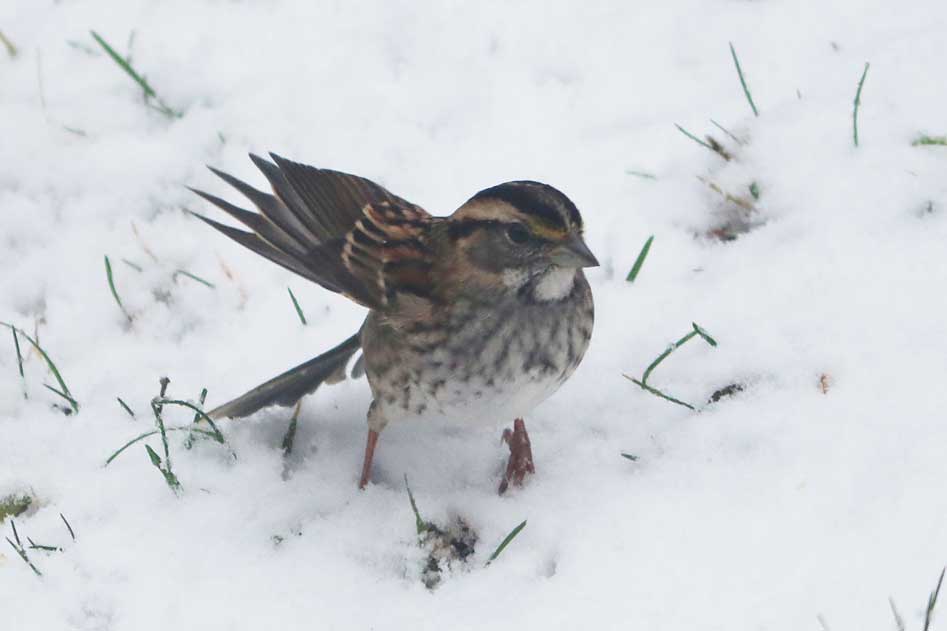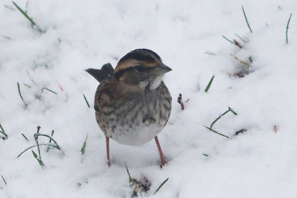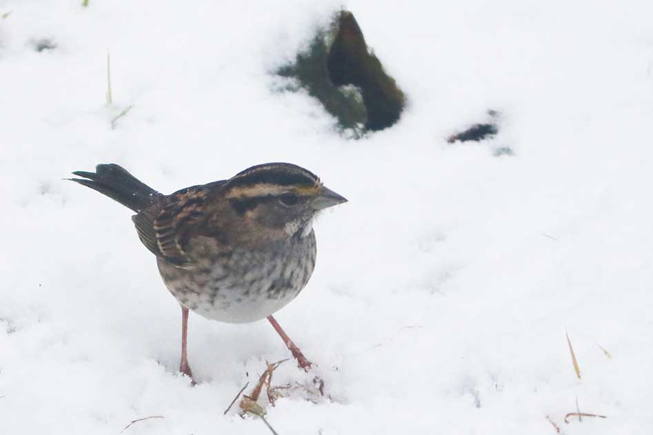 White-throated sparrow? No, it's delightful to see a song sparrow join the crowd. Like a white-throated, it kicks in one place to uncover seeds or suet covered by snow or leaves.