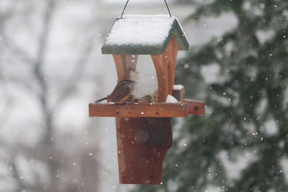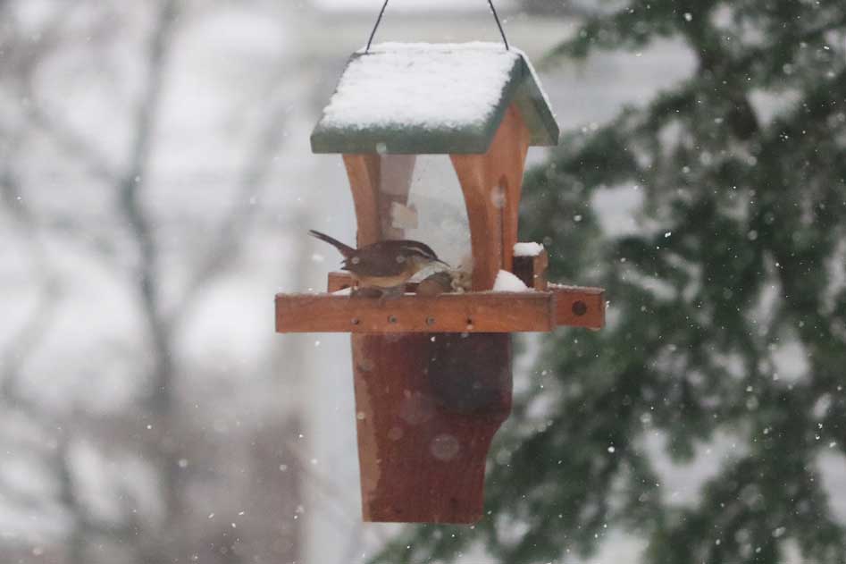 Not seen for almost a year, a Carolina wren checks out the peanut feeder.