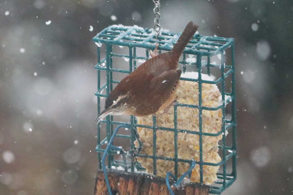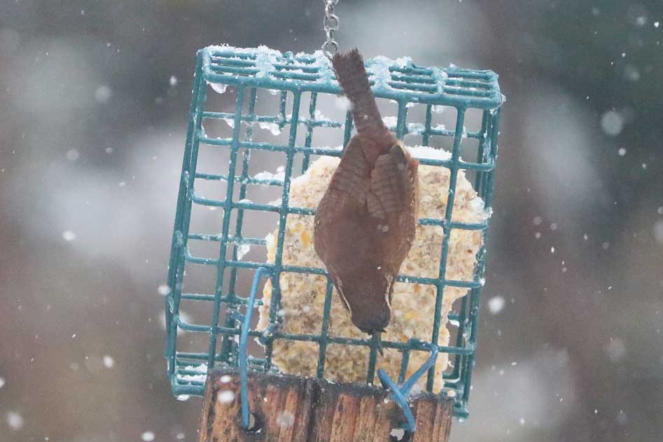 The Carolina wren grabs some grub on the suet feeder.